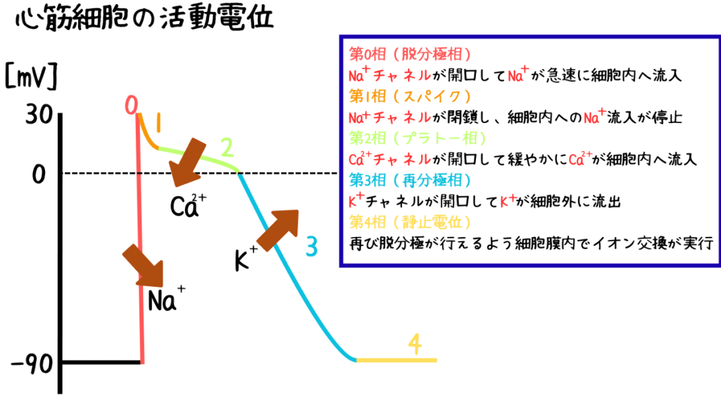 心筋細胞(ヒス束・プルキンエ線維・心房筋・心室筋)の活動電位は、