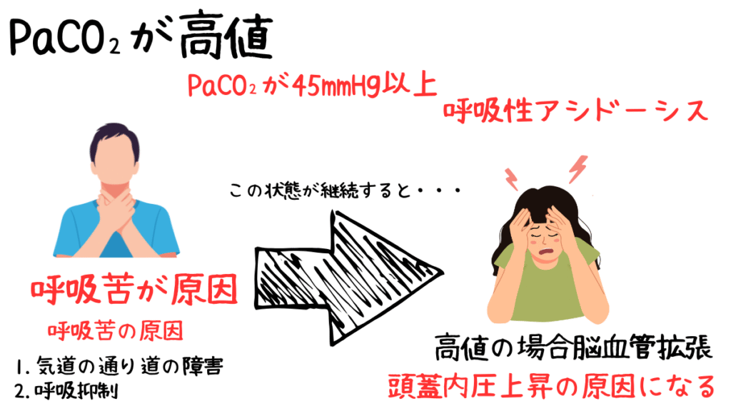 PaCO₂が高値の場合は、換気不足や気道・筋・神経の障害、薬剤による抑制などが背景となり、