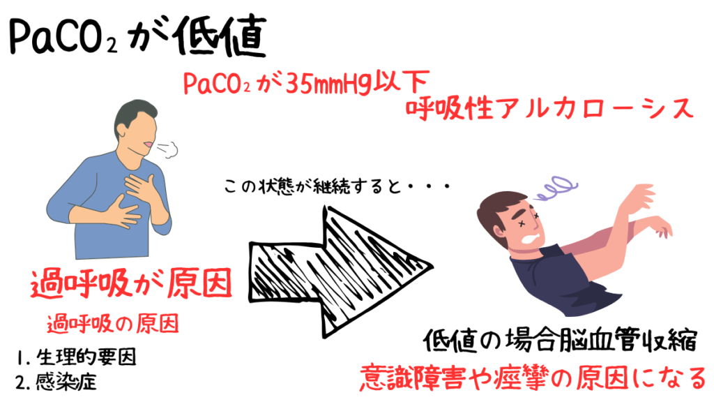 一方、低値の場合は、過換気や代謝性アシドーシスの代償、感染や興奮状態などが原因となり、