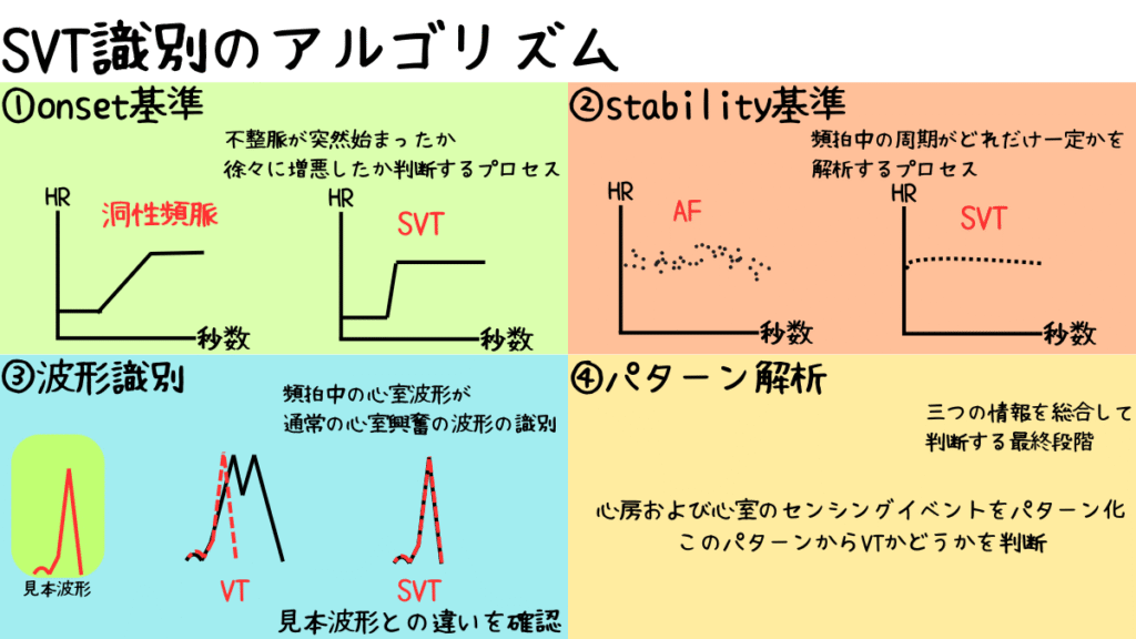 ICDやCRT-Dは、心室由来の頻拍と上室由来の頻拍を区別するために複数の手順を使っていますが、
